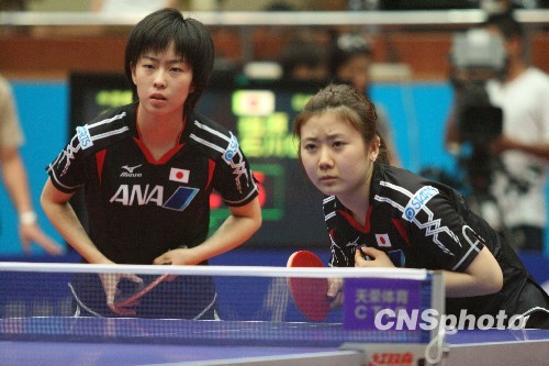 8月15日,2009年国际乒联职业巡回赛中国乒乓球公开赛(天津站)正赛阶段的比赛进入第二天。备受关注的日本乒坛名将“瓷娃娃”福原爱(右),在下午进行的女单、女双比赛中,先苦战七局憾负新加坡选手冯天薇;后与队友石川佳纯搭档出战中国香港选手姜华珺、帖雅娜,以总比分1:4败北,结束了本届中乒赛之旅。中新社发 郭晓帆 摄