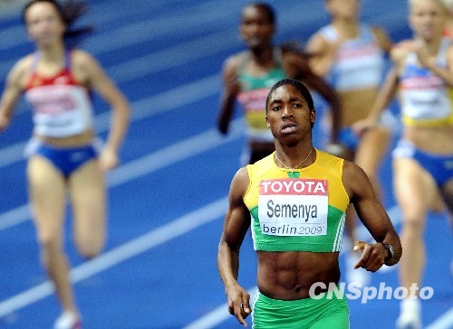 当地时间8月19日晚,第12届国际田径联合会世界田径锦标赛女子800米决赛在柏林奥林匹克体育场举行,南非选手塞蒙娅以1分55秒45的成绩领先第二名两秒多获得冠军。赛后,塞蒙娅没有出席冠军发布会,国际田联的官员解释说:目前一切判断为时过早,对塞蒙娅的性别鉴定需要一段时间。据悉,女子800米颁奖仪式将如期在当地时间20日晚举行。中新社发 任晨鸣 摄