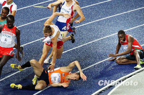 德国时间8月21日晚,大暴雨降临柏林,第12届国际田径联合会世界田径锦标赛继续在柏林奥林匹克体育场举行。在男子800米半决赛中,一路领先的苏丹选手KAKI(右一)不慎滑倒并造成多人碰撞翻滚,最后KAKI与荷兰选手Byam SOM(倒地者)遗憾退赛。中新社发 任晨鸣 摄
