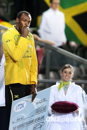 德国时间8月21日晚,第12届国际田径联合会世界田径锦标赛男子200米颁奖仪式在柏林奥林匹克体育场举行,当天年满23岁的牙买加超级名星博尔特挂上本届大赛第二块金牌并获得十万美元破世界纪录奖后,全场观众齐唱“祝你生日快乐”。优美的音乐与歌声令博尔特感慨万千。中新社发 任晨鸣 摄