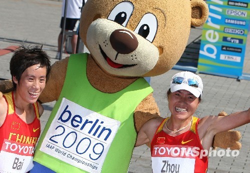 当地时间8月23日中午,第12届国际田径联合会世界田径锦标赛女子马拉松比赛在柏林市中心的勃兰登堡门举行,中国选手白雪在最后阶段奋勇超过日本选手,以2小时25分15秒的优异成绩获得金牌。另外参赛的3名中国选手分别获得第4、第5与第13的好成绩。图为赛后,本届大赛吉祥物“柏林熊”向获得冠军的白雪(左)、第4名的周春秀表示祝贺。中新社发 任晨鸣 摄