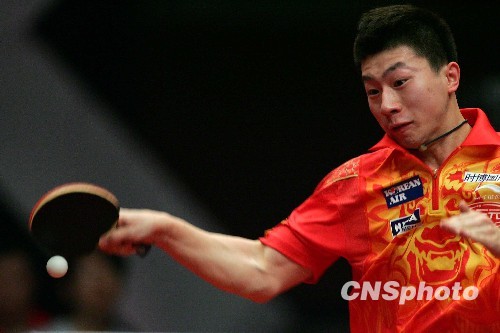 8月25日晚,三元食品-2009欧洲亚洲全明星乒乓球对抗赛在北京月坛体育馆开拍,由马琳、马龙领衔的亚洲明星队对阵由佩尔森、萨姆索诺夫率领的欧洲明星队。图为在第二盘比赛中亚洲明星队的马龙以3比0的比分横扫希腊悍将格林卡。中新社发 富田 摄