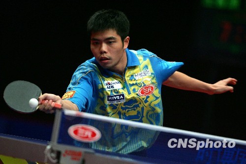 8月26日晚,三元食品-2009欧洲亚洲全明星乒乓球对抗赛在北京月坛体育馆展开第二天的争夺,由马琳、马龙领衔的亚洲明星队对阵由佩尔森、萨姆索诺夫率领的欧洲明星队。图为在当晚的首场比赛中,代表亚洲明星队出战的中华台北选手庄智渊3比0横扫瑞典老将佩尔森。中新社发 富田 摄