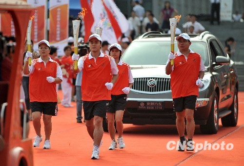 9月10日,第十一届全国运动会火炬传递活动广东起跑仪式在广州举行,广东籍奥运冠军胡佳担任主火炬手开始健身跑活动,广东省省长黄华华、广州市委书记朱小丹以及广东籍奥运冠军劳丽诗等3000多人参加仪式。中新社发 柯小军 摄