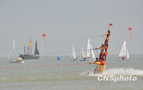 9月19日,首届中国南太湖帆船赛在浙江湖州开幕,30多条不同级别的帆船帆板在碧波万顷的南太湖上追风逐浪,这是中国帆船赛首次由海洋搬师内湖,帆船运动内湖时代就此开启。图为中国艺术滑水队做精彩表演。中新社发 赵晔娇 摄