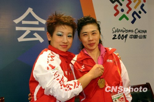 10月12日,第十一届全国运动会武术套路比赛12枚金牌将在滨州决出,女子长拳金牌是本届全运会武术套路产生的首枚金牌,坐拥主场优势的山东滨州籍运动员曹静最终以9.83分的成绩如愿夺冠。北京运动员刘晓蕾和来自河南的马岚分别获得银牌和铜牌。中新社发 郭强 摄