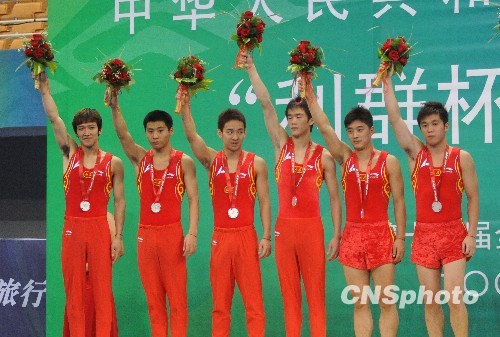 2009年10月13日,全运会蹦床比赛第二天,在当晚结束的男子团体比赛中,山东队以156.30的总成绩获得亚军。中新社发 张侃 摄