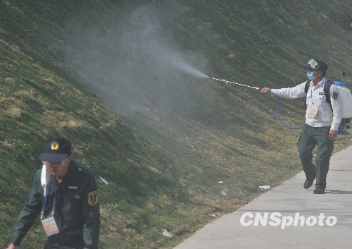 防疫人员10月15日在济南十一届全运会运动员村和媒体村喷洒消毒剂,严防甲型流感和传染病。中新社发 贾国荣 摄