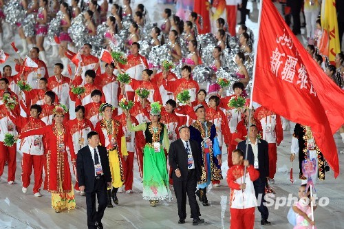 十月十六日晚,中华人民共和国第十一届运动会在山东济南开幕。图为新疆代表团入场。中新社发 汤彦俊 摄