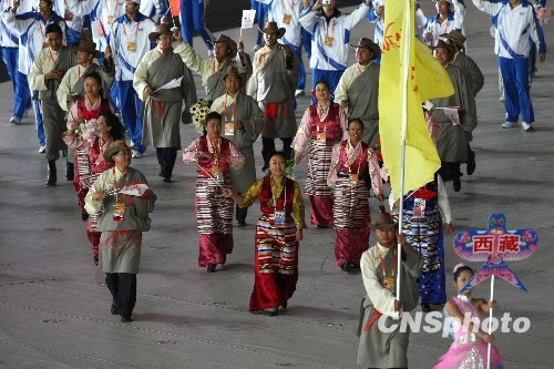 10月16日,第十一届全国运动会在山东济南正式开幕。图为西藏代表团入场。中新社发 富田 摄