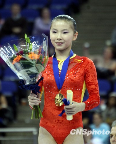 当地时间10月17日,在伦敦举行的2009年世界体操锦标赛上,北京奥运冠军、中国女将何可欣在高低杠决赛中占尽优势,以稳定的发挥夺得金牌,成绩为十六点零零零分。图为何可欣站在领奖台上。中新社发 魏群 摄