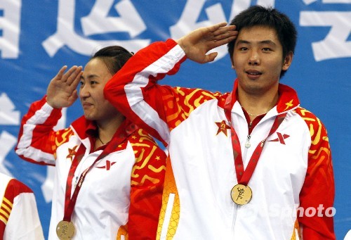 10月17日,第十一届全运会羽毛球混双决赛在青岛赛区举行,解放军队何汉斌(右)、赵婷婷险胜湖南队郑波、田卿,获得冠军。中新社发 张宇 摄