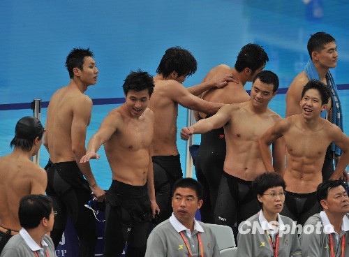 10月18日,十一届全运会男子4X100米自由泳接力赛预赛在济南举行,参赛的香港队活力小子们虽然战败,但表现出了精诚团结与顽强拼搏的精神。中新社发 贾国荣 摄