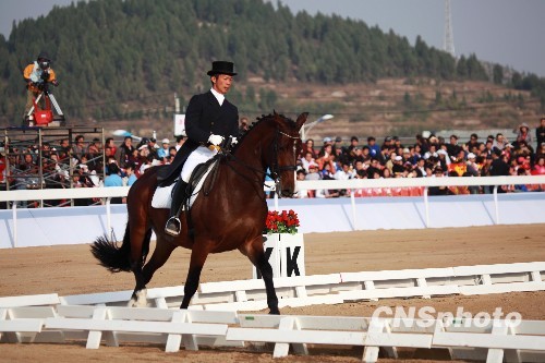 10月18日下午,广东队取得马术——盛装舞步团体赛团体第一名,获得十一全运会马术比赛首枚金牌。当日,第十一届全国运动会马术盛装舞步团体赛在山东济南历城国际赛马场举行,本次比赛为全运会有史以来参赛队伍最多的一次,汇集了广东、上海、内蒙古、新疆、浙江等国内马术最强的几支队伍,参赛的马匹共有130余匹,个别马匹身价超过千万元。图为广东队队员在比赛中。中新社发 王中举 摄