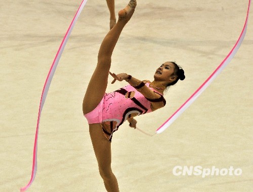 中国艺术体操精英10月19日在十一届全运会德州赛区展开个人全能决赛,图为浙江队小美女绳操英姿飒爽。中新社发 贾国荣 摄