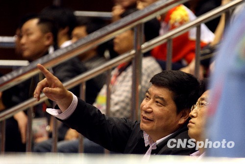 10月20日,全运会女子20米手枪决赛在山东省竞技体育学校射击馆举行,中国射击队总教练王义夫到现场观看队员比赛。中新社发 刘震 摄
