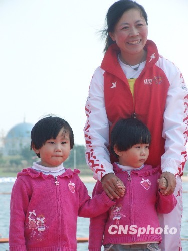 十月二十日上午结束的中国十一运会女子二千米八人单桨有舵手比赛中,由奥运会冠军奚爱华领衔的山东队夺得冠军。在家门口参赛的山东队日照籍舵手徐淼受到很大的关注。她年仅三岁的双胞胎女儿也来到现场为自己的妈妈加油,两个小家伙一出现就成为媒体关注的焦点。图为母女同享夺金牌的快乐。