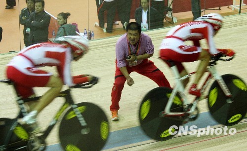10月20日,自行车比赛在山东省体育竞技学校继续进行,在男子场地追逐赛决赛中,山东队战胜了天津队夺冠,并以4:07.335的成绩打破了亚洲纪录。图为山东队在比赛中。中新社发 刘震 摄