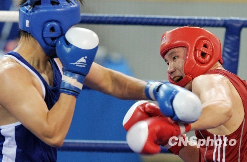 10月20日,第十一届全运会拳击赛在山东交通学院体育馆举行,来自解放军、山东、海南、澳门、江苏、辽宁、河南等代表队选手参加了54公斤级、91公斤级比赛,勇士在擂台上展开角斗。图为解放军选手李斌(红)在比赛中。中新社发 陈文 摄