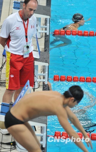 上海游泳队的洋教练10月20日晚在济南十一届全运会泳池边临阵磨枪指导队员,最终上海队在男子4X200米自由泳接力比赛中以7分12秒22的成绩打破全国纪录夺冠。中新社发 贾国荣 摄