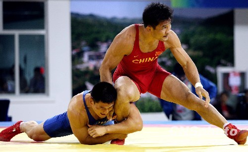 10月21日,第十一届全运会男子自由式摔跤96KG级别决赛中,解放军选手李瑞财(红)战胜了火车头体协的王园元(蓝)夺冠。图为李瑞财在比赛中。中新社发 刘震 摄
