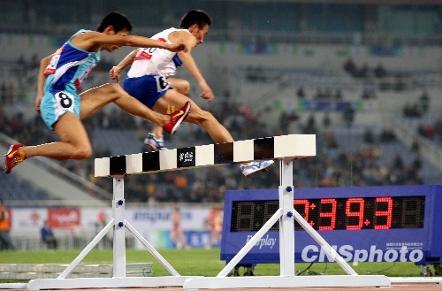10月21日晚,田径赛场男子3000米障碍决赛在济南奥体中心上演,结果山东选手孙文利在最后一圈成功超越江苏选手林向前,以8分25秒11的成绩夺冠。图为在最后一圈时孙文利开始赶超林向前。中新社发 刘震 摄