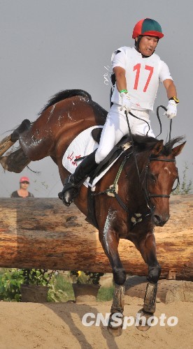 10月22日,西藏骑士边巴次仁驾驭名驹“雪域文成”,在济南国际赛马场十一届全运会马术越野障碍赛飞越横木。中新社发 贾国荣 摄