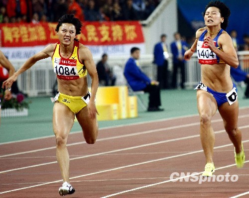 10月22日晚,在女子一百米飞人大战中,福建女选手王静在起跑一度落后的情况下奋起直追,最终以11秒50的成绩夺冠。图为王静在最后冲刺阶段。中新社发 刘震 摄