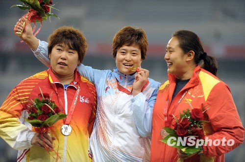 10月22日晚,黑龙江选手李艳凤(中)以66.40米夺得第十一届全运会女子铁饼决赛冠军。中新社发 陈文 摄