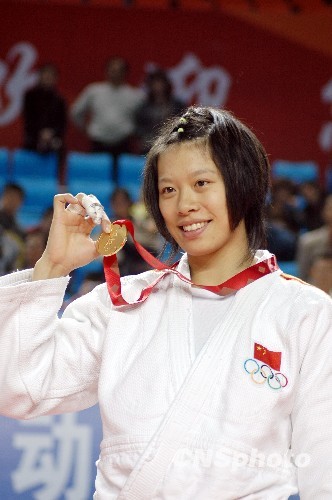 10月22日,在十一运会柔道女子78公斤级决赛中,江苏队张浙慧获得冠军,天津队潘玉庆获得亚军,青海队朱峰获得季军。中新社发 梁宝海 摄