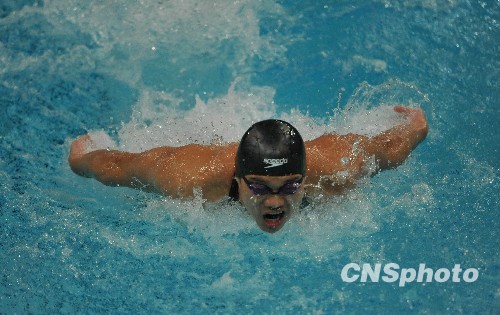 10月23日,在第十一届全国运动会男子100米蝶泳决赛中,广东队选手周嘉威以51秒24的成绩夺得冠军,并平该项目亚洲纪录。中新社发 吴峻 摄
