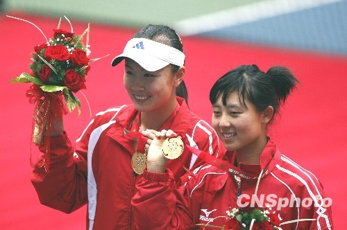 10月26日,第十一届全运会网球女子双打决赛在山东济南举行,来自天津的彭帅(左)、徐一璠战胜四川的晏紫、郑洁,获得冠军。彭帅在本届全运会上已拿到三枚金牌,明日她将挑战女单金牌。中新社发 张宇 摄