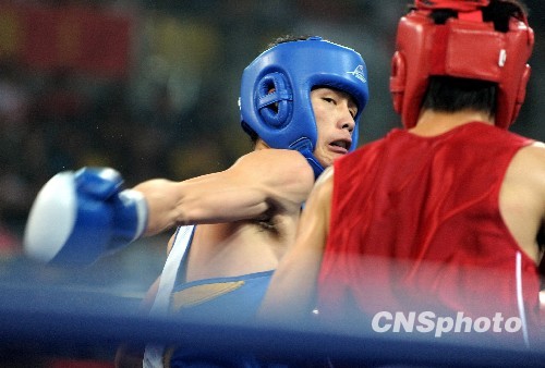 10月26日下午,安徽选手胡青战胜前卫体协队选手胡谦逊,夺第十一届全运会60公斤级拳击赛冠军。中新社发 陈文 摄