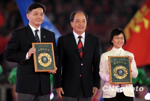 10月28日晚,第十一届全国运动会在济南闭幕,香港、澳门代表团获第十一届全运会参赛纪念奖。中新社发 陈文 摄