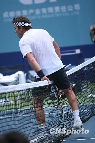 11月7日,ATP冠军巡回赛成都站的第三天比赛上,上帝似乎没能够让卡什继续走运,这场他屡次失误,最终不敌伊万尼塞维奇。图为比赛途中,卡什正翻越栏网到对方打球区域,以示不满。中新社发 张浪 摄