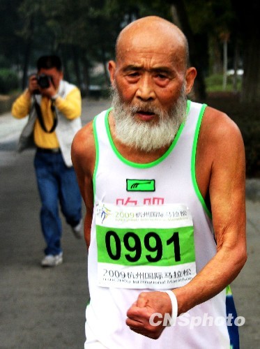 杭州11月8日上午,西湖国际马拉松在浙江省杭州市西湖风景名胜区举行,一位85岁长须老人成记者追逐焦点。中新社发 王旻 摄