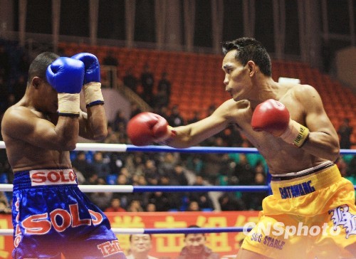 十一月二十八日晚,世界拳击组织(WBO)洲际拳王争霸赛在山东省苍山县体育馆开打,经过四个回合的激战,菲律宾拳王巴他旺击倒对手,捍卫了自己亚太地区最次轻量级拳王荣誉。图为菲律宾拳王巴他旺对阵印尼选手阿米萨。中新社发 周秀光 摄