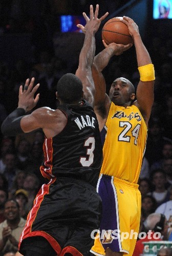 当地时间12月4日晚,科比率洛杉矶湖人在主场迎战迈阿密热火,“小飞侠”科比遭遇“闪电侠”韦德的阻击。最终湖人凭借科比的一记压哨3分球,以108比107逆转险胜客队。科比全场拿下33分。中新社发 张炜 摄