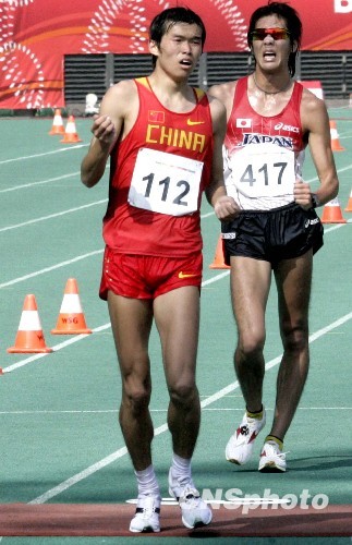 12月10日,2009东亚运动会男子20公里竞走决赛在香港将军澳运动场举行,中国男选手于伟(左)夺冠。当天是田径的第一个比赛日,中国选手于伟以1小时26分46秒的成绩夺得本届东亚运动会的田径首金,而女子比赛中中国队的李燕飞以1小时35分33秒的成绩获得金牌。 中新社发 张勤 摄