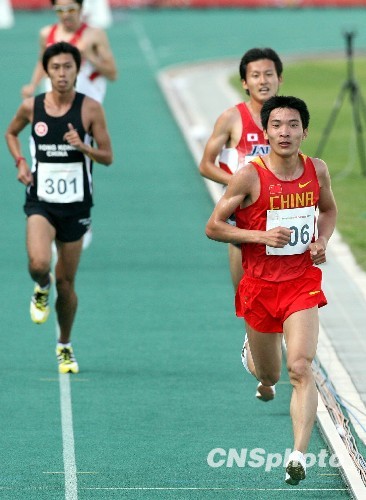 十二月十一日,在香港举行的2009年东亚运动会结束了田径赛场第二天十个项目的争夺。参赛的中国选手李子成在5000米赛事中以13分53秒48获得冠军,这也是他本赛季的最佳战绩,日本选手松冈佑起和上野裕一郎分获二三名。中新社发 洪少葵 摄