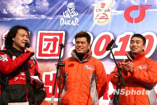 中国金城摩托车队12月23日在南京为车手苏文敏(中)、魏广辉(右)出征达喀尔拉力赛举行仪式,两位车手当晚将飞赴阿根廷参加2010年1月1日举行的为期15天的比赛,向完赛再一次发起冲击。中新社发 赵振清 摄
