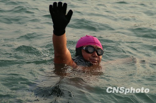 1月1日,大连市冬泳奇人苗治青创公开水域基尼斯世界耐寒纪录。当日,在中国冬泳基地――辽宁省大连市金石滩国宾浴场下水,在国家体育总局所派二名国际级裁判员的见证下,顺利地创下了这一纪录。当时气温为零下8.3摄氏度,水温为2.8摄氏度,苗治青在水中游了1小时5分35秒。中新社发 宋太盛 摄