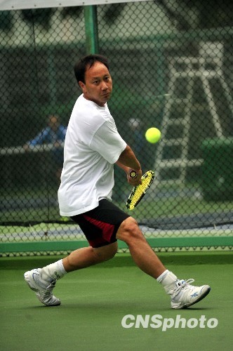 一月五日,著名网球选手张德培作赛前练习。由莎拉波娃、威廉姆斯等世界顶级网球员参与香港网球精英赛,将于六至九日在香港维园举行。中新社发 谭达明 摄