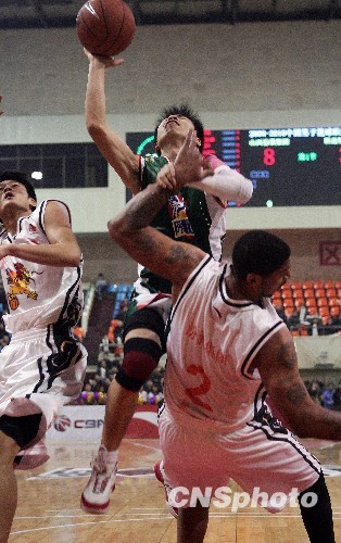 1月6日晚,2009-2010赛季CBA第八轮打响,山西汾酒男篮坐镇山西太原滨河体育中心迎战4连败的陕西锂源动力。最终以125:96战胜对手,迎来自己的主场首胜,并送给对手陕西锂源动力5连败。图为陕西锂源动力球员突破前火箭球员泰勒(白)的防守上篮。中新社发 张云 摄