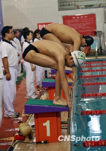 1月28日,2010年全国春季游泳锦标赛在河北唐山市游泳馆举行。来自北京、天津、河北、山西、辽宁、解放军等14个省、市、行业体协代表队的近300名运动员参赛。此次参赛队员大部分为“90后”,年龄最小的11岁。图为“90后”与“80后”共竞男子组100米自由泳。中新社发 翟羽佳 摄