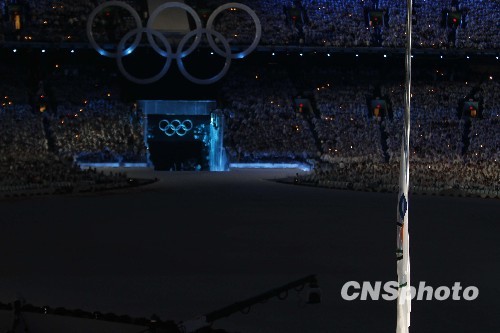 当地时间2月12日,第21届冬季奥林匹克运动会开幕式在温哥华举行。这是开幕式上,加拿大国旗和国际奥委会会旗缓缓降下。为悼念在12日上午训练中因碰撞事故不治身亡的格鲁吉亚雪橇选手诺·库马里塔什威利,冬奥会组委会和国际奥委会在开幕式上降半旗致哀。中新社发 盛佳鹏 摄