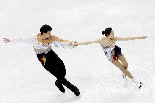 当地时间2月14日,2010年温哥华冬奥会花样滑冰双人短节目的比赛在加拿大温哥华太平洋体育馆举行,张丹/张昊花样滑冰双人短节目名列第五。中新社发 盛佳鹏 摄