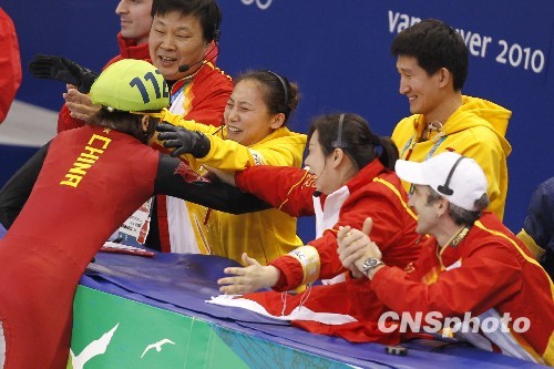 当地时间2月17日,温哥华冬奥会短道速滑女子500米比赛在温哥华太平洋体育馆结束,中国选手王濛摘得金牌。图为王濛与教练李琰拥抱。中新社发 盛佳鹏 摄