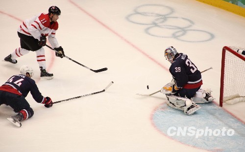 当地时间2月28日,加拿大冰球队与美国队争夺本届冬奥会最后一块,同时也是份量最重的一块金牌时,凭借格罗斯比在加局赛的一粒金子般的入球,绝杀美国队,从而在这被世人称为火星撞地球的巅峰对决中赢得最后胜利。图为加局赛中加拿大队的一次犀利进攻。中新社发 赖海隆 摄