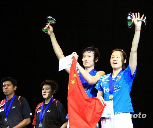 当地时间3月14日,在伯明翰举行的第100届全英羽毛球公开赛混合双打决赛中,从资格赛一路过关斩将杀进决赛的中国选手张楠/赵芸蕾续写传奇,以2比1 战胜印尼选手维迪安托/纳西尔,获得冠军。图为张楠/赵芸蕾在领奖台上。中新社发 魏群 摄